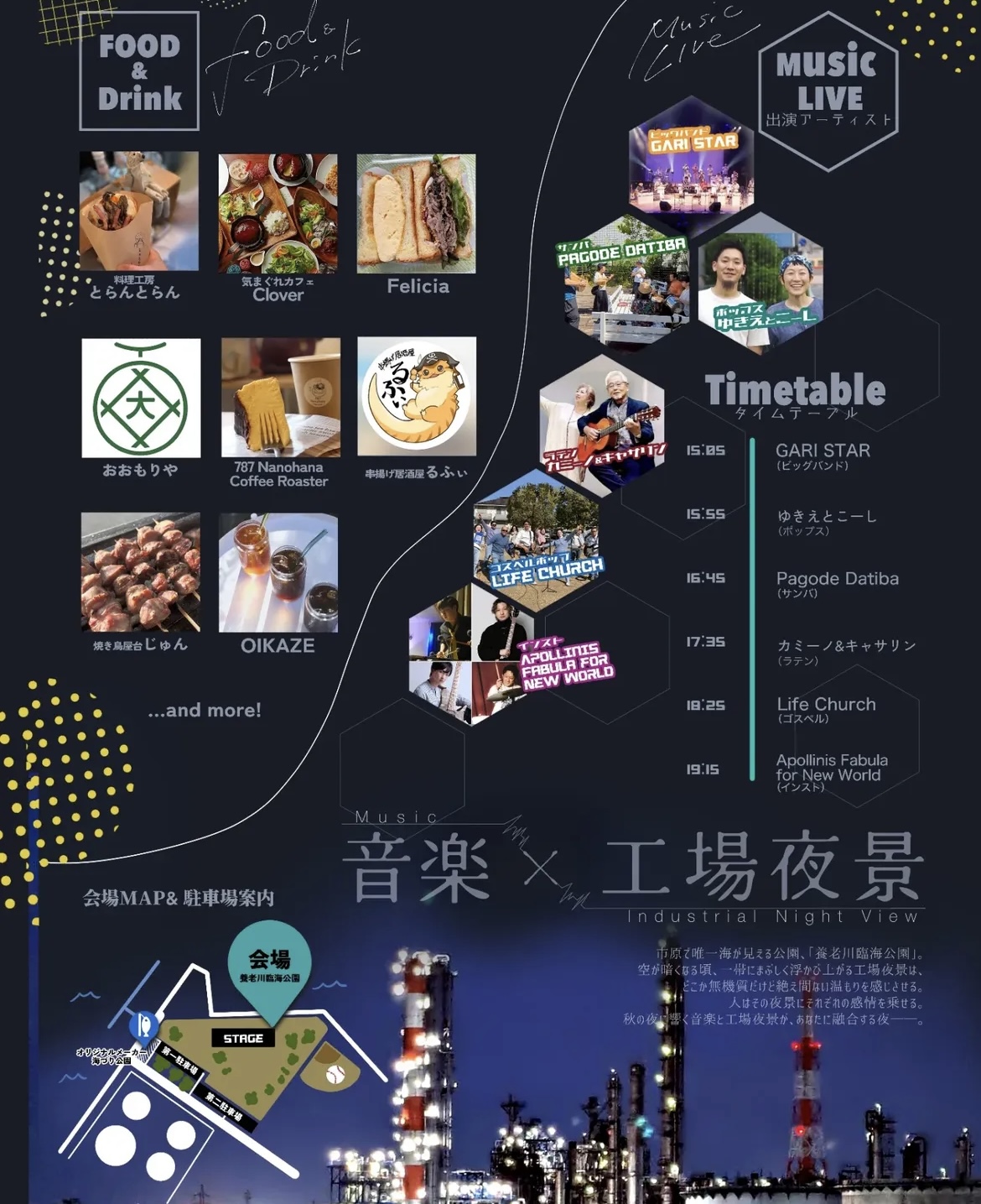 工場夜景を見ながら、素敵な音楽と美味しいグルメはいかがですか♪