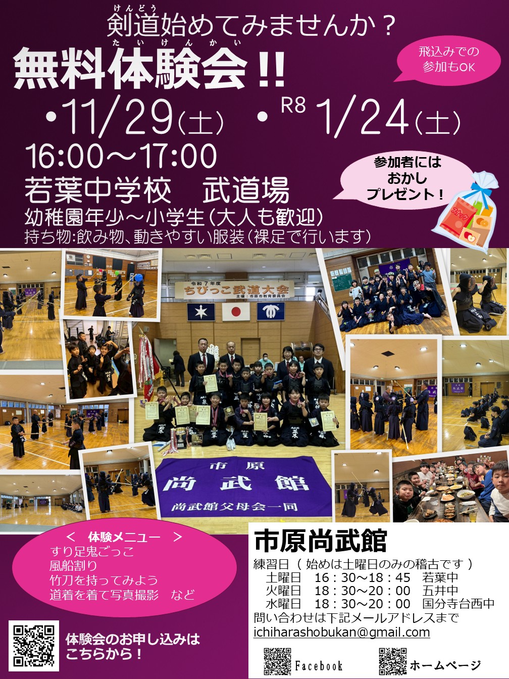 「市原尚武館」は、五井地区で活動されている剣道の道場です。就学前の子どもから一般の方まで幅広い年齢層の剣士が在籍しています。そんな「市原尚武館」が、剣道の無料体験会を開催するそうです!!