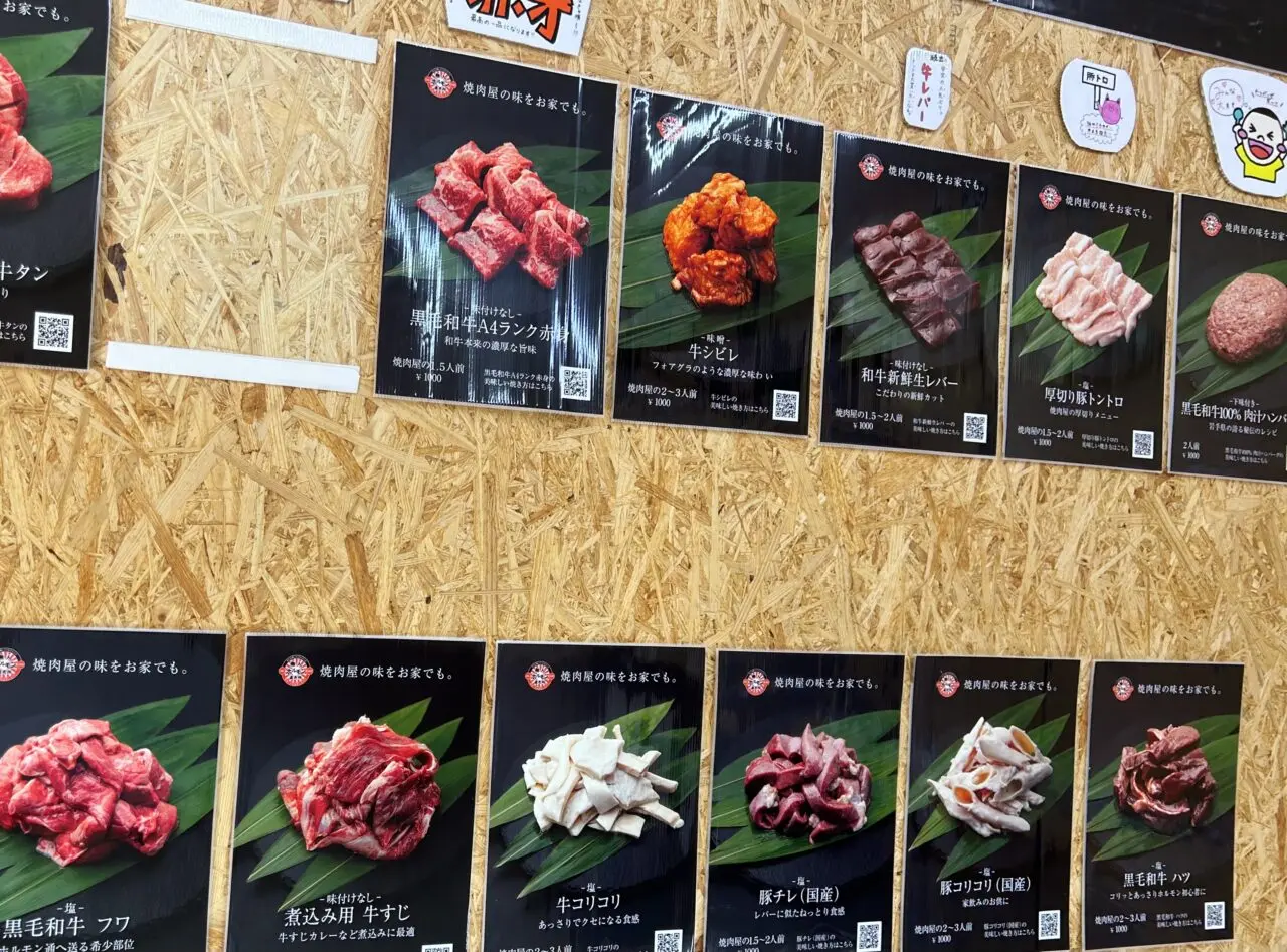壁面には、販売されているお肉が紹介されています。ホルモン直売所という名前の通り、ホルモンの種類が豊富です♪ホルモンの他にも、和牛カルビやハラミ、黒毛和牛A4ランクの赤身も販売されています。