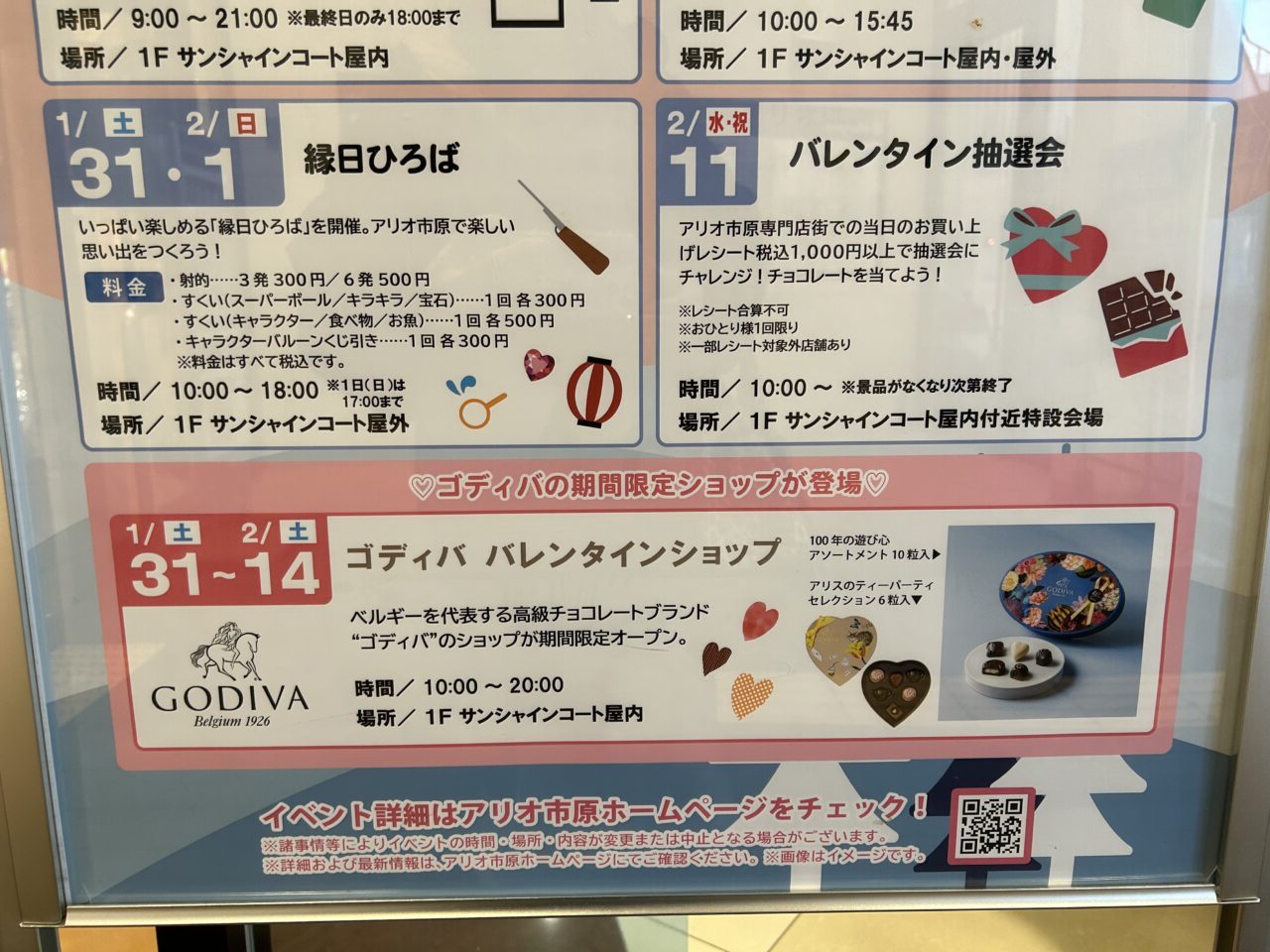 高級チョコレートブランド「ゴディバ」の期間限定ショップも登場するので、バレンタインのチョコレートもアリオ市原で♪
